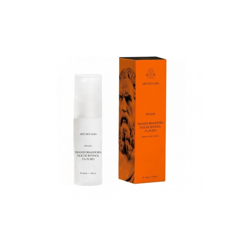 La Fórmula Transformadora Noche Retinol Puro 1% de Arturo Alba es una crema sedosa nocturna con Retinol Puro al 1% de concentración e ingredientes activos que promueven la autoreparación de la función barrera y la síntesis de ceramidas en la propia epidermis. Es un retinol al 1%, el doble que el 0.5%. Contiene además agentes calmantes y agentes hidratantes de alta eficacia. Fórmula indicada para pieles muy habituadas a los retinoides y con experiencia en el uso de retinoles de concentraciones inferiores. Que el 0,5%. Contiene además agentes calmantes y agentes hidratantes de alta eficacia. Fórmula indicada para pieles muy habituadas a los retinoides y con experiencia en el uso de retinoles de concentraciones inferiores. Acción renovadora celular profunda.