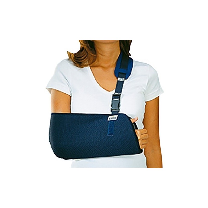 Este cabestrillo azul, hecho de tejido transpirable en forma de bolsa para el codo y el antebrazo, ofrece ajuste y soporte. Incluye una banda para regular la altura del brazo y una almohadilla protectora de hombro en neopreno. Su función principal es mantener y estabilizar la articulación del hombro.