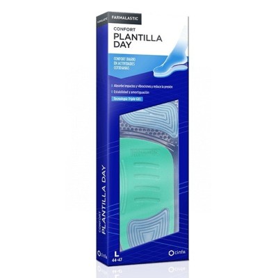 Las plantillas DAY de Farmalastic están desarrolladas con Tecnología Triple Gel TPE (Thermoplastic Elastomer) que ayudan a absorber los impactos y vibraciones de forma eficaz y a reducir la presión que los pies soportan a lo largo del día. Ayudan a proporcionar de forma reforzada mayor estabilidad y soporte en el arco plantar y amortiguación en metatarso y talón. Su sistema de tallaje y ajuste permiten una adecuada adaptación anatómica de cada talla al número de calzado. Pueden utilizarse con el calzado habitual o deportivo.